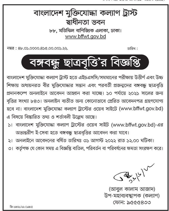 বাংলাদেশ মুক্তিযােদ্ধা কল্যাণ ট্রাস্টের ওয়েব সাইট (www.bffwt.gov.bd)-এর অভ্যন্তরীণ ই-সেবা হতে বঙ্গবন্ধু ছাত্রবৃত্তির আবেদন করা যাবে। বঙ্গবন্ধু ছাত্রবৃত্তি’তে অনলাইনে আবেদনের বর্ধিত তারিখঃ ৩১ আগস্ট ২০২২ রাত ১২.০০ ঘটিকা।