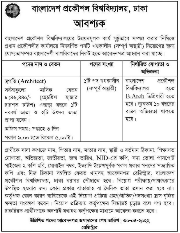 শিক্ষাগত যোগ্যতা: বাংলাদেশ প্রকৌশল বিশ্ববিদ্যালয় থেকে স্থাপত্য বিষয়ে স্নাতক ডিগ্রি এবং কমপক্ষে ১০ বছরের চাকরির অভিজ্ঞতা থাকতে হবে।