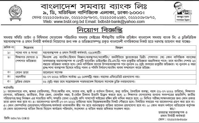 সমবায় ব্যাংক নিয়োগ বিজ্ঞপ্তি ২০২২ : Bangladesh Samabaya Bank Limited সমবায় সমিতি আইন ও বিধিমালা মােতাবেক পরিচালিত সমবায় সেক্টরের শীর্ষস্থানীয় আর্থিক প্রতিষ্ঠান বাংলাদেশ সমবায় ব্যাংক লিঃ এ চুক্তিভিত্তিক মহাব্যবস্থাপক ও প্রধান নির্বাহী কর্মকর্তা নিয়ােগের জন্য দক্ষ ও অভিজ্ঞতাসম্পন্ন প্রকৃত বাংলাদেশী নাগরিকদের নিকট হতে দরখাস্তের আহবান জানিয়ে সমবায় ব্যাংক নিয়োগ বিজ্ঞপ্তি ২০২২ প্রকাশ করেছে । আগ্রহ ও যোগ্যতা থাকলে আজই আবেদন করুন।